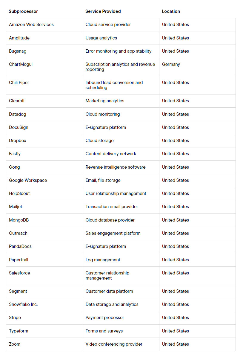 In an effort to be as transparent as possible to our customers, the Subprocessor list includes any third-parties who may have access to your data by utilizing our service. The type of data that the Subprocessor has access to is limited to only what is reasonably necessary to perform the service provided.